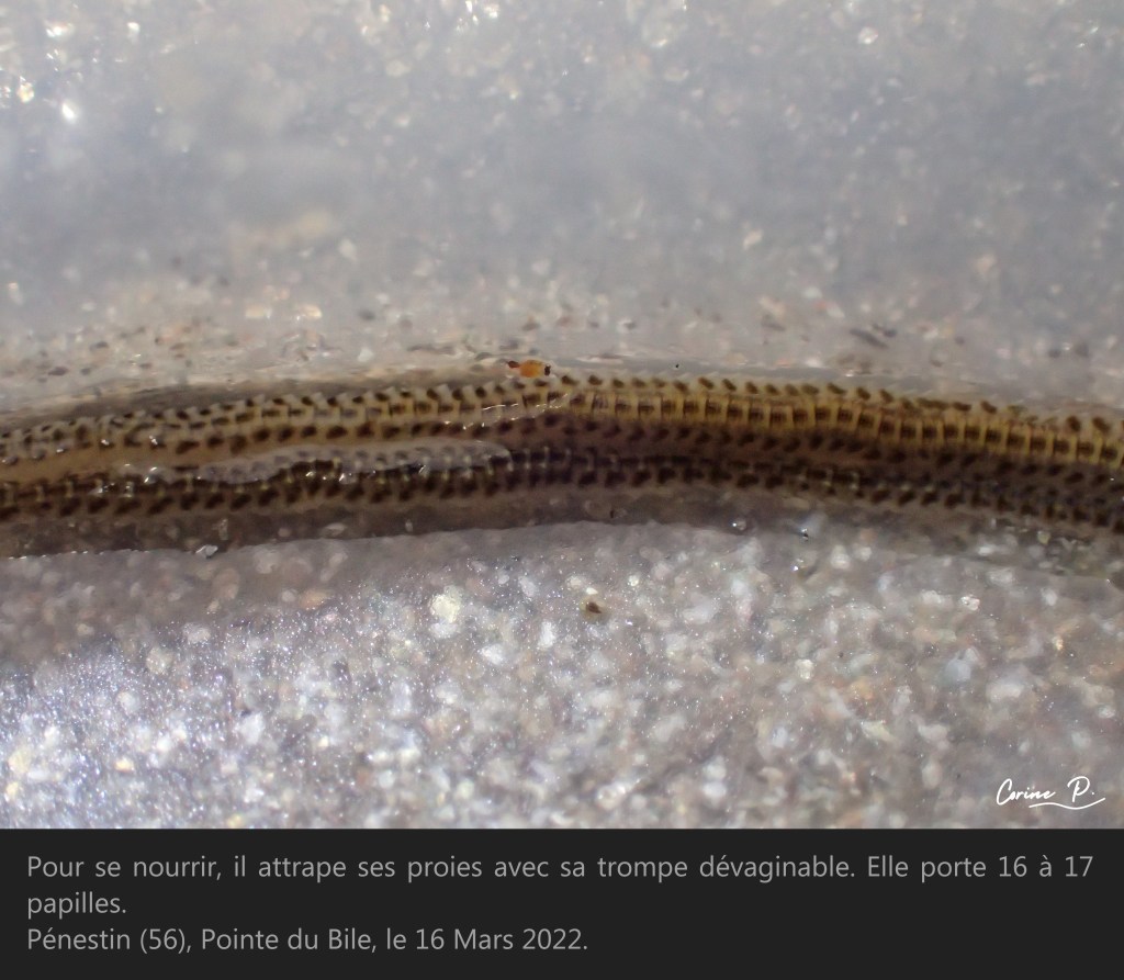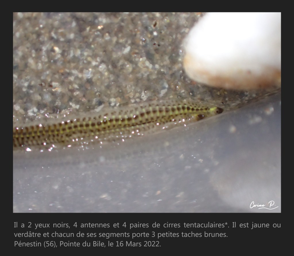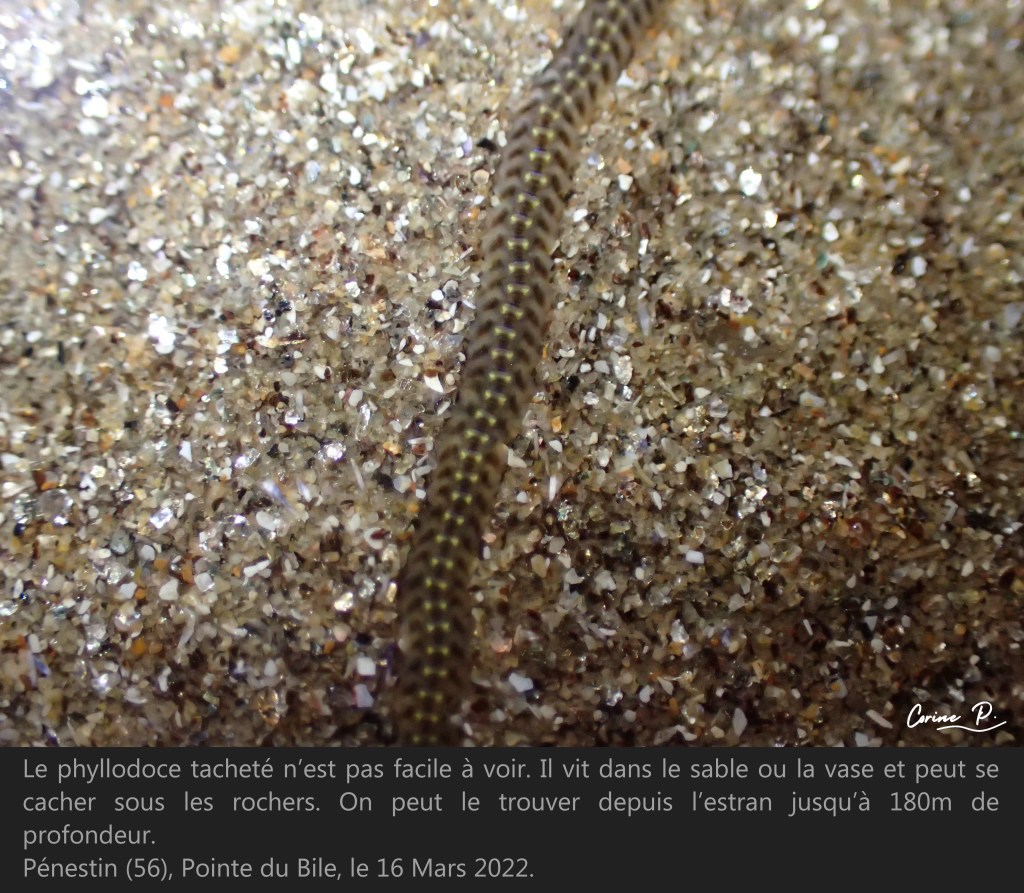 Il existe de nombreuses espèces de phyllodoce, pour être sûr de l’espèce à 100% il faudrait examiner les parapodes et la trompe à la loupe binoculaire. Les animaux présentés ci-dessous ont été observés et remis très rapidement dans leur milieu.