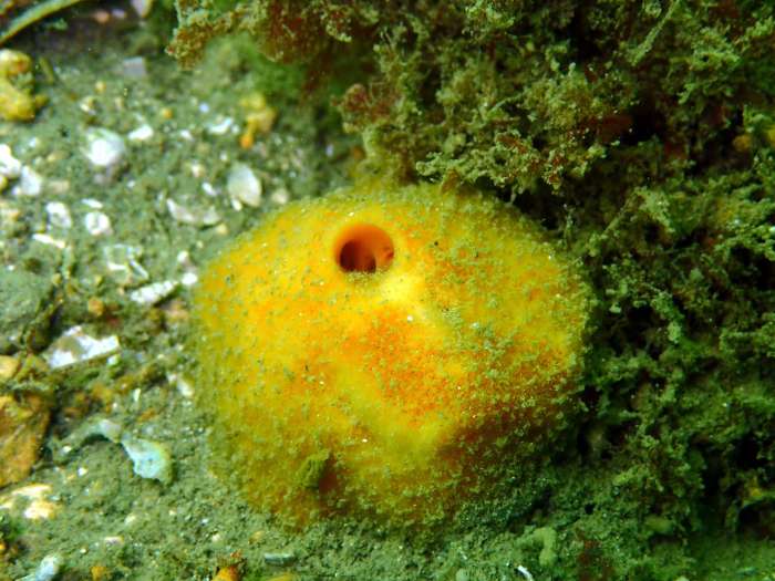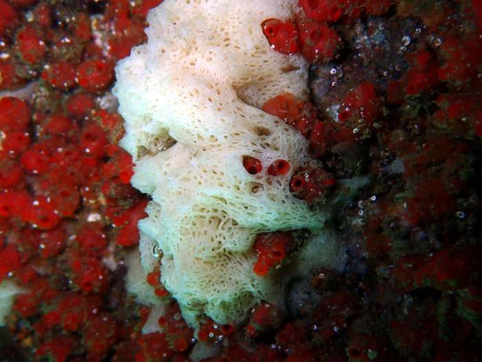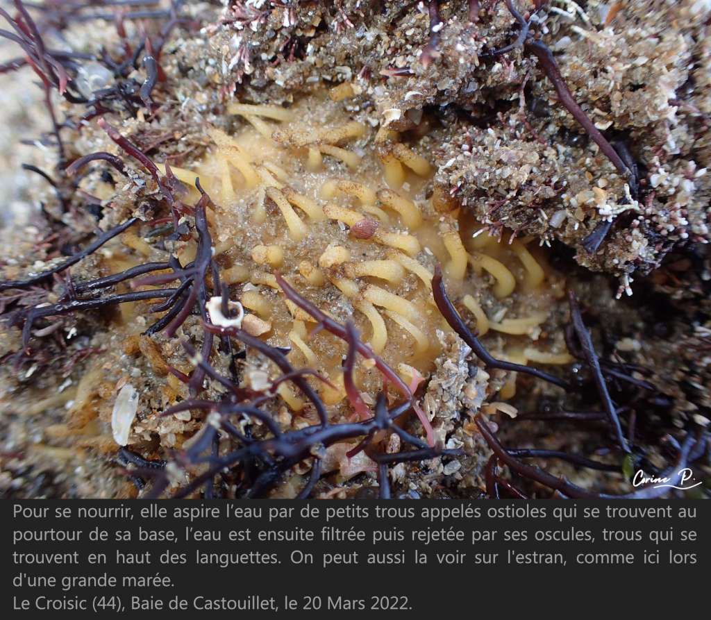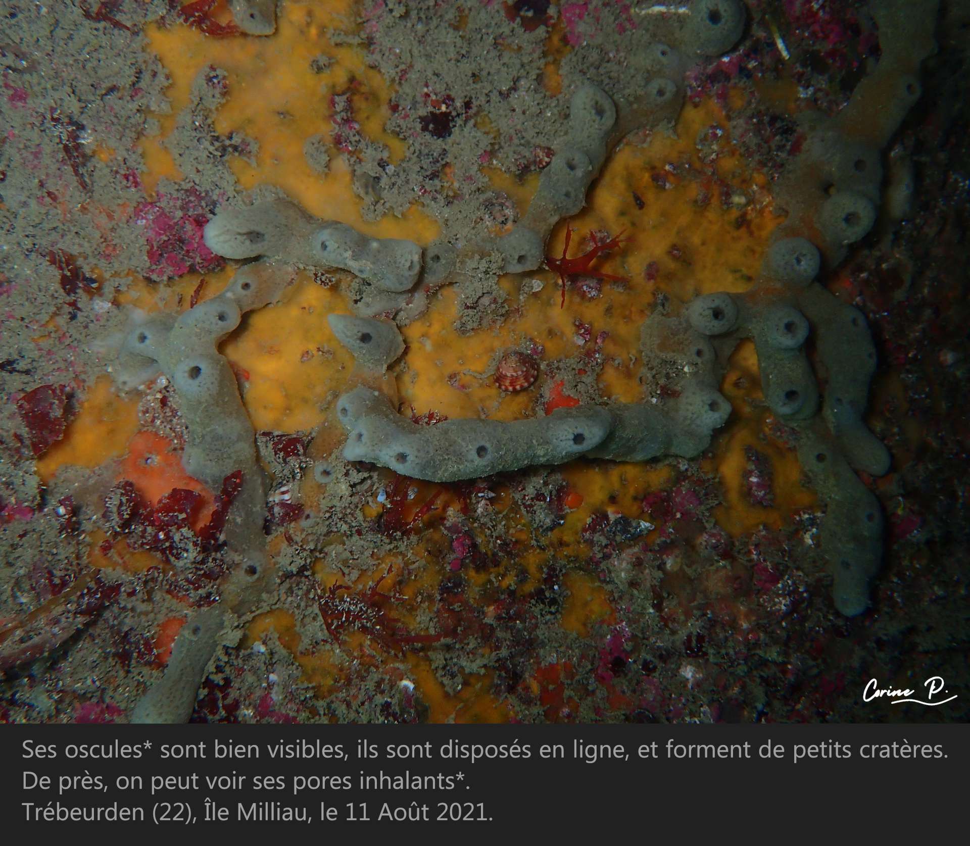 *Oscule : La paroi des éponges est percée d’orifices inhalants appelés les ostioles. L’eau y entre pour ensuite passer dans une cavité centrale puis elle ressort par un orifice exhalant : l’oscule. C’est grâce à cette circulation de l’eau que l’éponge s’alimente et qu’elle respire.